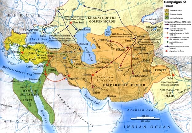 The list of those whom Timur faced and defeated is impressive: the Golden Horde in Mongolia, the Mamluks in Egypt and Syria, the Ottomans in Turkey, and the Delhi Sultanate in India. He fought with every noteworthy power in or around Central Asia and was victorious every time. In fact, Timur was never once defeated in battle. The speed and ferocity of his conquests is frightening even to think about — one can scarcely imagine what it must have been like to experience, or hear of in real time, the unstoppable advance of this mysterious conqueror. When news spread that Bayezid I, sultan of the mighty Ottomans, had been defeated in battle and thrown in a cage by Timur, it must surely have seemed like no force on earth could stop him.