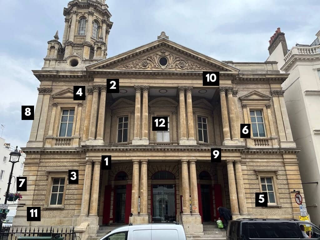 5 & 6: Beside and just behind the columns of the portico are some more projecting elements. On the upper floor we have Composite pilasters, but on the ground floor we only have unornamented blocks of masonry. The simplicity to complexity theme is once again present. And, in both cases, this slight projection away from the brickwork of the walls establishes a growing sense of articulation — that is, of varying surfaces, materials, depths, and shapes. One could quite easily have reverted straight to the brick wall, but these instead provide a sense of evolution and variation across the façade, while also relieving the potential tedium of a completely flat wall.